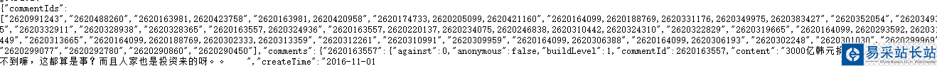 #coding=utf-8__author__ = 'kongmengfan123'import urllibimport reimport jsonimport timedef gethothtml(url):#最熱評論 page=urllib.urlopen(url) html=page.read() get_json(html)def gethnewtml():#最新評論有5頁 for i in range(1,6): url = 'http://comment.news.163.com/api/v1/products/a2869674571f77b5a0867c3d71db5856/threads/C4QFIJNS0001875O/comments/newList?offset=%d&limit=30&showLevelThreshold=72&headLimit=1&tailLimit=2&callback=getData&ibc=newspc&_=1478010624978'%i*30 page = urllib.urlopen(url) html=page.read() time.sleep(1) get_json(html)def get_json(json_): end_=re.compile(r'/);')#將json網頁轉化成python數據 begain=re.compile(r'getData/(') json_=begain.sub('',json_) json_=end_.sub('',json_) ajson=json.loads(json_) lis=ajson["commentIds"]#獲得每條評論的鍵 n=0 for i in range(1,len(lis)): try: xulie=re.compile('/d{10,}')#取得準確評論的鍵(去掉回復) bia=re.findall(xulie,lis[n]) w.write(ajson['comments'][bia[len(bia)-1]]['user']['nickname'].encode('utf-8')+'|') except KeyError: w.write(ajson['comments'][bia[len(bia)-1]]['user']['location'].encode('utf-8')+'|') if (len(lis[n])>13): xulie=re.compile('/d{10,}') bia=re.findall(xulie,lis[n]) w.write(ajson['comments'][bia[len(bia)-1]]['content'].encode('utf-8')+'/n') else: w.write(ajson['comments'][lis[n]]['content'].encode('utf-8')+'/n') n=n+1 return lisw=open('wangyi.txt','w')w.write('用戶名'+'|'+'熱門評論'+'/n')hot_=gethothtml('http://comment.news.163.com/api/v1/products/a2869674571f77b5a0867c3d71db5856/threads/C4QFIJNS0001875O/comments/hotList?offset=0&limit=40&showLevelThreshold=72&headLimit=1&tailLimit=2&callback=getData&ibc=newspc')w.write('用戶名'+'|'+'最新評論'+'/n')gethnewtml()w.close()