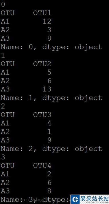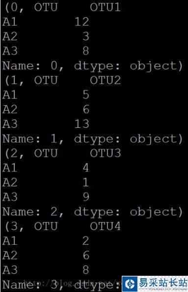 import pandas as pdotu = pd.read_csv("otu.txt",sep="/t")for index,row in otu.iterrows(): print index print row