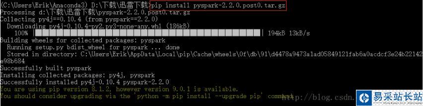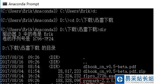 下載好后就可以離線安裝 Python 包了,還是打開 Aanconda Prompt ,然后切換到存放pyspark-2.2.0.post0.tar.gz的目錄文件,我的路徑是D:/下載/迅雷下載