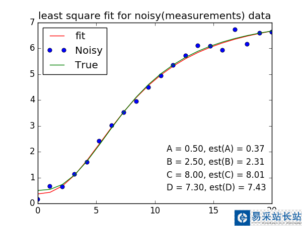 import numpy as npfrom scipy import optimizeimport matplotlib.pyplot as pltdef logistic4(x, A, B, C, D): return (A-D)/(1+(x/C)**B)+Ddef residuals(p, y, x): A, B, C, D = p return y - logisctic4(x, A, B, C, D)def peval(x, p): A, B, C, D = p return logistic4(x, A, B, C, D)A, B, C, D = .5, 2.5, 8, 7.3x = np.linspace(0, 20, 20)y_true = logistic4(x, A, B, C, D)y_meas = y_true + 0.2 * np.random.randn(len(y_true))