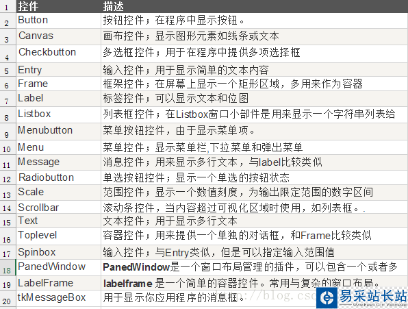 目前有15種Tkinter的部件。我們提出這些部件以及一個簡短的介紹,在下面的表: