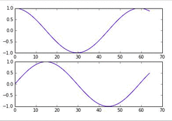 import mathimport randomimport numpy as npimport matplotlibimport matplotlib.pyplot as plt%matplotlib inline# set up matplotlibis_ipython = 'inline' in matplotlib.get_backend()if is_ipython: from IPython import displayplt.ion()def plot_durations(y): plt.figure(2) plt.clf() plt.subplot(211) plt.plot(y[:,0]) plt.subplot(212) plt.plot(y[:,1]) plt.pause(0.001) # pause a bit so that plots are updated if is_ipython: display.clear_output(wait=True) display.display(plt.gcf())x = np.linspace(-10,10,500)y = []for i in range(len(x)): y1 = np.cos(i/(3*3.14)) y2 = np.sin(i/(3*3.14)) y.append(np.array([y1,y2])) plot_durations(np.array(y))