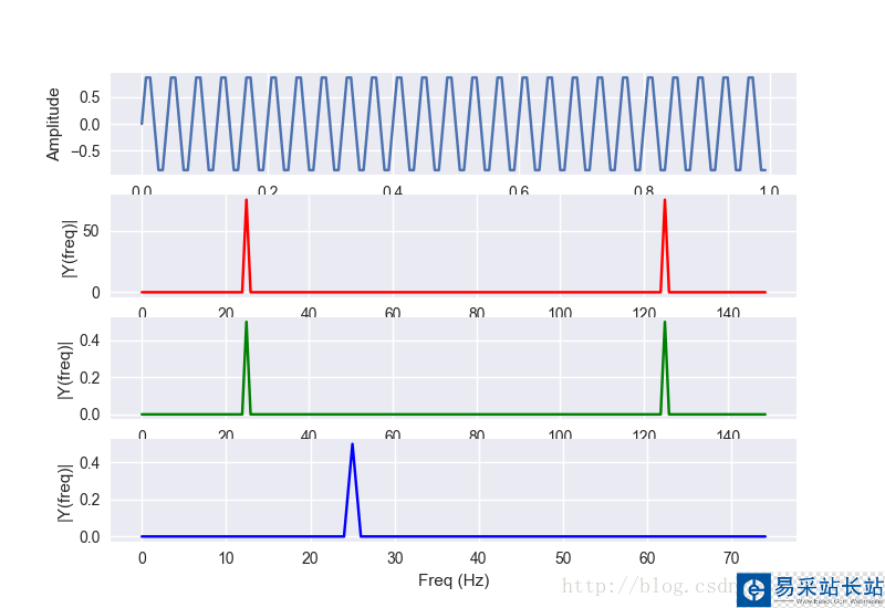 # -*- coding: utf-8 -*-import matplotlib.pyplot as pltimport numpy as npimport seabornFs = 150.0; # sampling rate采樣率Ts = 1.0/Fs; # sampling interval 采樣區間t = np.arange(0,1,Ts) # time vector,這里Ts也是步長ff = 25; # frequency of the signaly = np.sin(2*np.pi*ff*t)n = len(y) # length of the signalk = np.arange(n)T = n/Fsfrq = k/T # two sides frequency rangefrq1 = frq[range(int(n/2))] # one side frequency rangeYY = np.fft.fft(y) # 未歸一化Y = np.fft.fft(y)/n # fft computing and normalization 歸一化Y1 = Y[range(int(n/2))]fig, ax = plt.subplots(4, 1)ax[0].plot(t,y)ax[0].set_xlabel('Time')ax[0].set_ylabel('Amplitude')ax[1].plot(frq,abs(YY),'r') # plotting the spectrumax[1].set_xlabel('Freq (Hz)')ax[1].set_ylabel('|Y(freq)|')ax[2].plot(frq,abs(Y),'G') # plotting the spectrumax[2].set_xlabel('Freq (Hz)')ax[2].set_ylabel('|Y(freq)|')ax[3].plot(frq1,abs(Y1),'B') # plotting the spectrumax[3].set_xlabel('Freq (Hz)')ax[3].set_ylabel('|Y(freq)|')plt.show()