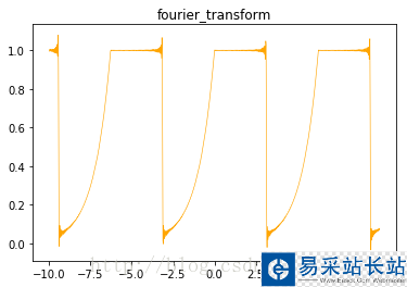 from pylab import *x = mgrid[-10:10:0.02] # 這里類似于MATLAB用冒號產生步長為0.02的序列,但是語法和MATLAB不同n = arange(1,1000)def fourier_transform(): a0 = (1-exp(-pi))/pi+1 s=a0/2 for i in range(1,100,1): s0 = ( (1-(-1)**i*exp(-pi))/(pi*(1+i**2))*cos(i*x)+1/pi*( (-i*(1-(-1)**i*exp(-pi)))/(1+i**2) + (1-(-1)**i)/i ) * sin(i*x) ) s=s+s0 plot(x,s,'orange',linewidth=0.6) title('fourier_transform') show() fourier_transform()