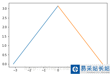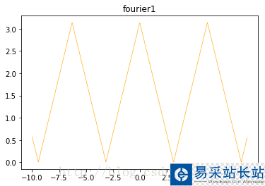 from pylab import *def fourier1(): s=pi/2 for i in range(1,100,1): s0 = 2/pi*(1-(-1)**i)/i**2 * cos(i*x) s=s+s0 plot(x,s,'orange',linewidth=0.6) title('fourier1') show()fourier1()
