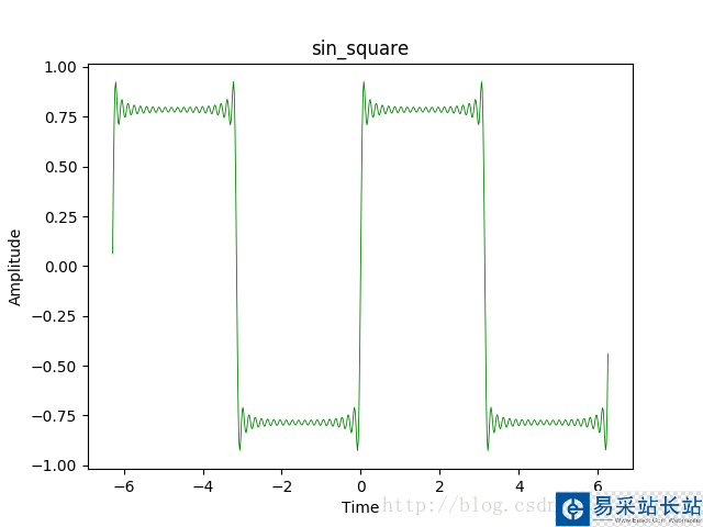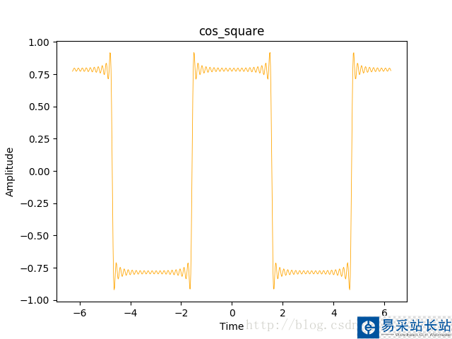 # 分析傅里葉級數分解之后cos和sin的和項的圖像輸出from numpy import mgrid,sin,cos,array,pifrom matplotlib.pyplot import plot,show,title,legend,xlabel,ylabelx = mgrid[0:10:0.02] # 這里類似于MATLAB用冒號產生步長為0.02的序列,但是語法和MATLAB不同# 下面的這段循環實現y=sin(x)+sin(3x)+...+sin(19x)def cos_square(): y1 = 0; for i in range(0,20,1): b = (-1)**(i)*cos((2*i+1)*x)/(2*i+1) y1=b+y1 # 這種求和的方法是從C語言移植過來的 plot(x,y1,'orange',linewidth=0.6) title('cos_square') xlabel('Time') ylabel('Amplitude') show()def sin_square(): y2 = 0 for i in range(0,20,1): b = sin((2*i+1)*x)/(2*i+1) y2=b+y2 # 這種求和的方法是從C語言移植過來的 plot(x,y2,'g',linewidth=0.6) title('sin_square') xlabel('Time') ylabel('Amplitude') show()cos_square() sin_square()