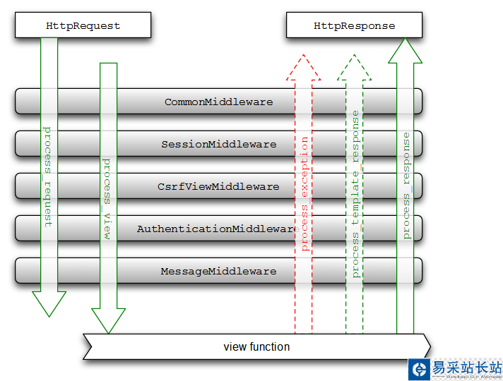 一般我們我們從瀏覽器發(fā)出一個(gè)請(qǐng)求 Request,得到一個(gè)響應(yīng)后的內(nèi)容 HttpResponse ,這個(gè)請(qǐng)求傳遞到 Django的過程如下,process request 和 process response的執(zhí)行順序正好相反,如下圖所示: