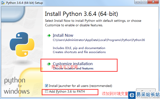 在這里我選擇的是自定義安裝(Customize installation),一定要勾選Add_Python 3.6 to PATH,防止手工添加環(huán)境變量 ,添加到環(huán)境變量也可以等安裝完成之后手動(dòng)添加到環(huán)境變量中,如果不添加環(huán)境變量運(yùn)行python時(shí)則會(huì)出現(xiàn)如下界面: