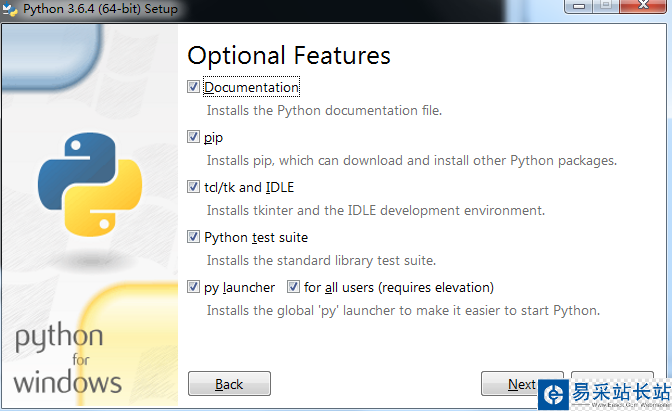 選擇安裝的屬性,Documentation、pip、tcl/tk and IDLE 必須安裝,tcl/tk and IDLE是Python環(huán)境的開發(fā)環(huán)境窗口,pip用來(lái)安裝numpy等package。
