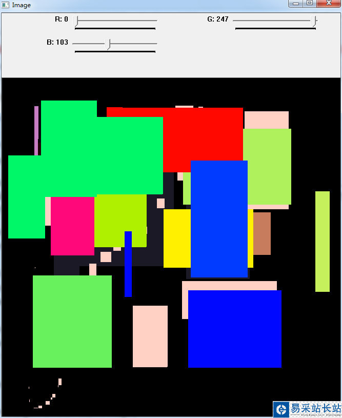 import cv2import numpy as np# null functiondef nothing(x): passDrawing = FalseMode = TrueIX,IY = -1,-1def drawCircle(Event,X,Y,Flags,Param): R = cv2.getTrackbarPos('R','Image') G = cv2.getTrackbarPos('G','Image') B = cv2.getTrackbarPos('B','Image')#get color value Color = (B,G,R); global IX,IY,Drawing,Mode if Event == cv2.EVENT_LBUTTONDOWN: Drawing = True IX,IY = X,Y elif Event == cv2.EVENT_MOUSEMOVE and Flags == cv2.EVENT_FLAG_LBUTTON: if Drawing == True: if Mode == True: cv2.rectangle(Img,(IX,IY),(X,Y),Color,-1) else: cv2.circle(Img,(X,Y),3,Color,-1); elif Event == cv2.EVENT_LBUTTONUP: Drawing = False#create image with 3 chanelsImg = np.zeros((660,660,3),np.uint8)#create windowcv2.namedWindow('Image')#create track bar, range for 0~255cv2.createTrackbar('R','Image',0,255,nothing)cv2.createTrackbar('G','Image',0,255,nothing)cv2.createTrackbar('B','Image',0,255,nothing)#set mouse ackcv2.setMouseCallback('Image',drawCircle)while(1): cv2.imshow('Image',Img) k = cv2.waitKey(10)&0xFF #switch draw mode if k == ord('m'): Mode = not Mode elif k == 27: break#you must destroy all of sourcescv2.destroyAllWindows()
