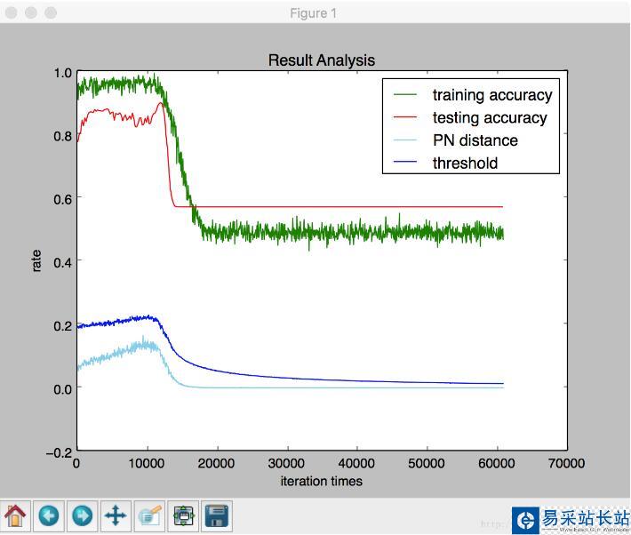 # -*- coding: UTF-8 -*-import numpy as npimport matplotlib as mplimport matplotlib.pyplot as plt#這里導入你自己的數據#......#......#x_axix,train_pn_dis這些都是長度相同的list()#開始畫圖sub_axix = filter(lambda x:x%200 == 0, x_axix)plt.title('Result Analysis')plt.plot(x_axix, train_acys, color='green', label='training accuracy')plt.plot(sub_axix, test_acys, color='red', label='testing accuracy')plt.plot(x_axix, train_pn_dis, color='skyblue', label='PN distance')plt.plot(x_axix, thresholds, color='blue', label='threshold')plt.legend() # 顯示圖例plt.xlabel('iteration times')plt.ylabel('rate')plt.show()#python 一個折線圖繪制多個曲線