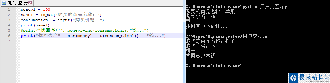 money1 = 100 #定義變量money1name1 = input("名稱:" ) #定義變量買了什么東西name1consumption1 = input("價格:") #定義變量consumption1價格是多少print(name1) #輸出買的東西名稱print("找回客戶", money1-int(consumption1), "塊") #計算剩余多少錢,逗號是將各個部分的拼接起來,是獨立的部分,所以互相不影響。