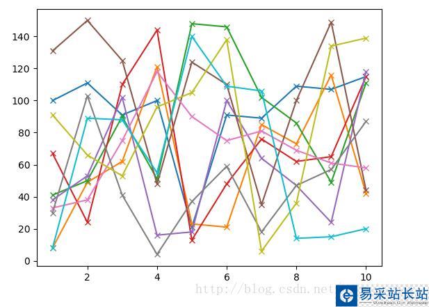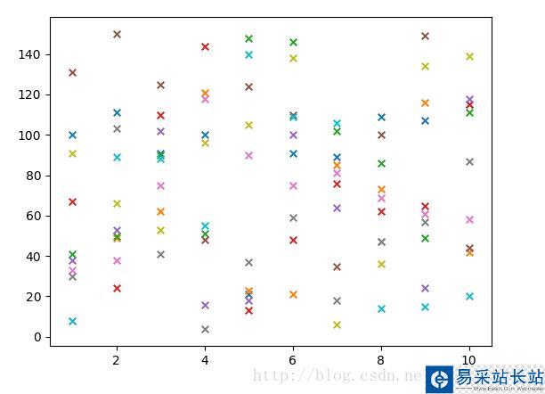 #!usr/bin/env python#encoding:utf-8 '''__Author__:沂水寒城功能:折線圖、散點(diǎn)圖測(cè)試''' import randomimport matplotlib import matplotlib.pyplot as plt def list2mat(data_list,w): ''' 切片、轉(zhuǎn)置 ''' mat=[] res=[] for i in range(0,len(data_list)-w+1,w): mat.append(data_list[i:i+w]) for i in range(len(mat[0])): one_list=[] for j in range(len(mat)): one_list.append(mat[j][i]) res.append(one_list) return res def draw_pic_test(): ''' 作圖 ''' data_list=[] for i in range(100): data_list.append(random.randint(2,150)) month_list=range(1,11,1) mat=list2mat(data_list,w=10) for one_list in mat: one_list=[int(one) for one in one_list] plt.plot(month_list,one_list,"x-",label="test_zhexian") plt.savefig('test_zhexian.png') plt.close() for one_list in mat: one_list=[int(one) for one in one_list] plt.scatter(month_list,one_list,marker='x',label='test_sandian',s=30) plt.savefig('test_sandian.png') plt.close() if __name__ == '__main__': draw_pic_test()