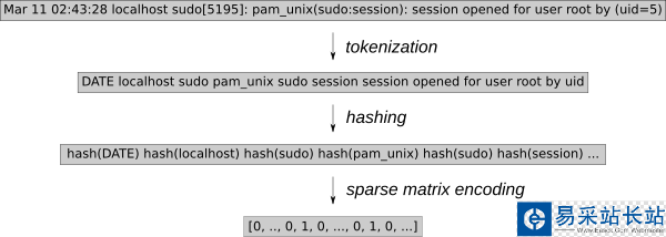 的日志事件必須轉(zhuǎn)換為數(shù)值。k-NN回歸。使用通用特征提取工具HashingVectorizer允許將該進(jìn)程應(yīng)用于任何類型的日志。它對每個單詞進(jìn)行散列,并在稀疏矩陣中對每個事件進(jìn)行編碼。為了進(jìn)一步減少搜索空間,令牌化將刪除已知的隨機(jī)單詞,例如日期或IP地址。