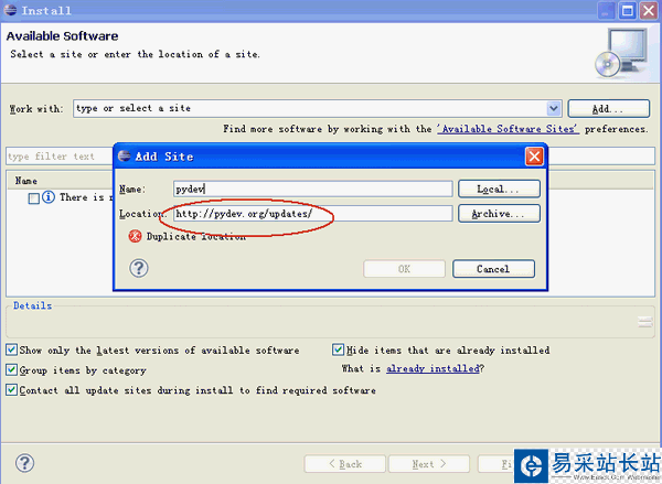 點擊Add,添加pydev的安裝地址:http://pydev.org/updates/,如下圖所示。安裝舊版pydev需要添加安裝地https://dl.bintray.com/fabioz/pydev/old/,并去掉選項Show only the lastest version of available software。