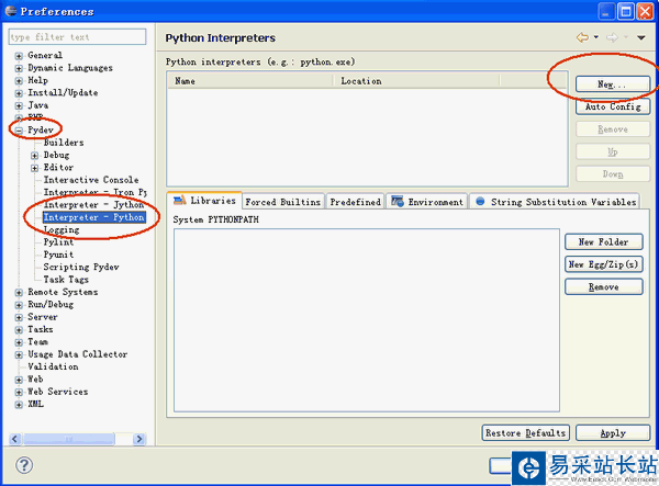 安裝完成后,還需要設置一下PyDev,選擇Window -> Preferences來設置PyDev。設置Python的路徑,從Pydev的Interpreter - Python頁面選擇New