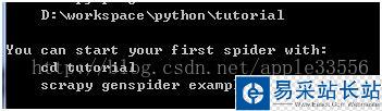 現(xiàn)在試下看看建個(gè)爬蟲項(xiàng)目,按照說(shuō)明文檔鍵入命令scrapy startproject tutorial,目錄已經(jīng)出來(lái)(圖3),看來(lái)是沒(méi)問(wèn)題了。但為了驗(yàn)證是否安裝成功,還得跑一下看看,第一次創(chuàng)建項(xiàng)目的時(shí)候,系統(tǒng)會(huì)提示可以跑個(gè)例子看看(圖4)。按照提示鍵入命令