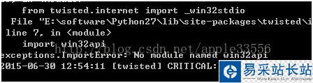 運(yùn)行爬蟲,結(jié)果如下(圖5),報(bào)錯(cuò)了,貌似是缺少win32api,立即上網(wǎng)下了一個(gè)(http://sourceforge.net/projects/pywin32/files/pywin32/Build%20219/),