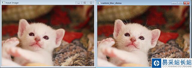 #!/usr/bin/env python# _*_ coding:utf-8 _*_import cv2 as cvimport numpy as np def custom_blur_demo(image): kernel = np.array([[0, -1, 0], [-1, 5, -1], [0, -1, 0]], np.float32) #銳化 dst = cv.filter2D(image, -1, kernel=kernel) cv.imshow("custom_blur_demo", dst) src = cv.imread("F:/miao3.png")cv.namedWindow("input image", cv.WINDOW_AUTOSIZE)cv.imshow("input image", src)custom_blur_demo(src)cv.waitKey(0)cv.destroyAllWindows()