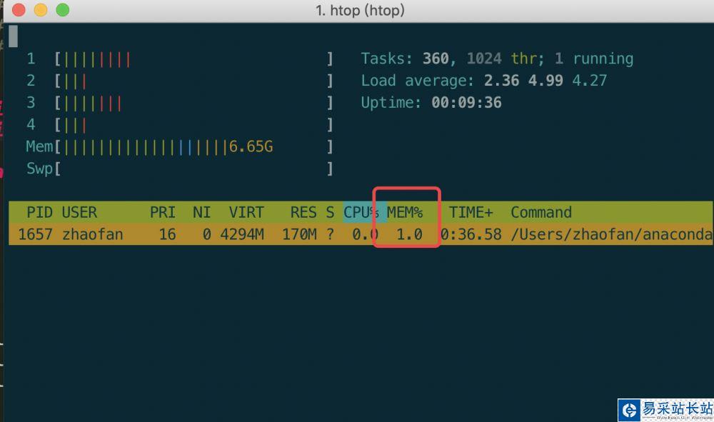 因為我的代碼是在linux上跑的,或者mac上我們都可以通過htop非常方面的實時查看我們程序內存的占用情況,我們先將服務端啟動,查看一下我們此時的內存情況可以看到占用的
