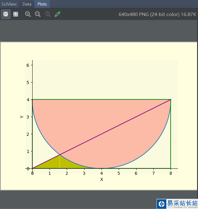 import matplotlib.pyplot as pltimport numpy as npdef init(): plt.xlabel('X') plt.ylabel('Y') fig = plt.gcf() fig.set_facecolor('lightyellow') fig.set_edgecolor("black") ax = plt.gca() ax.patch.set_facecolor("lightgray") # 設置ax區域背景顏色 ax.patch.set_alpha(0.1) # 設置ax區域背景顏色透明度 ax.spines['right'].set_color('none') ax.spines['top'].set_color('none') ax.xaxis.set_ticks_position('bottom') ax.yaxis.set_ticks_position('left') ax.spines['bottom'].set_position(('data', 0)) ax.spines['left'].set_position(('data', 0))# 原下半函數def f1(px, r, a, b): return b - np.sqrt(r**2 - (px - a)**2)# 斜線函數def f2(px, m, n): return px*n/m# 斜線函數2def f3(px, m, n): return n-1*px*n/mif __name__ == '__main__': r = 4 # 圓半徑 m = 8 # 寬 n = 4 # 高 a, b = (4, 4) # 圓心坐標 init() x = np.linspace(0, m, 100*m) y = np.linspace(0, n, 100*n) # 半圓形 y1 = f1(x, r, a, b) plt.plot(x, y1) # 矩形橫線 plt.plot((x.min(), x.max()), (y.min(), y.min()), 'g') plt.plot((x.min(), x.max()), (y.max(), y.max()), 'g') plt.plot((x.max(), x.max()), (y.max()+2, y.max()+2), 'g') # 畫點(8,6)避免圖形變形 # 矩形縱向 plt.plot((x.min(), x.min()), (y.min(), y.max()), 'g') plt.plot((x.max(), x.max()), (y.min(), y.max()), 'g') # 斜線方法 y2 = f2(x, m, n) plt.plot(x, y2, 'purple') # 陰影部分填充 xf = x[np.where(x <= 0.5*x.max())] plt.fill_between(xf, y.min(), f1(xf, r, a, b), where=f1(xf, r, a, b) <= f2(xf, m, n), facecolor='y', interpolate=True) plt.fill_between(xf, y.min(), f2(xf, m, n), where=f1(xf, r, a, b) > f2(xf, m, n), facecolor='y', interpolate=True) # 半圓填充 plt.fill_between(x, y1, y.max(), facecolor='r', alpha=0.25) plt.show()Draw.py2.計算源碼,其中side是要不要計算圖形邊框上的點,理論上side只能為True;t設置越大運行時間越長也越精準