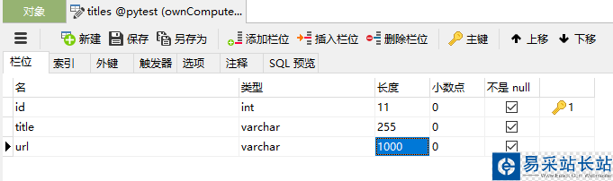 mysql:新建一個數(shù)據(jù)庫pytest,建立一張名為titles的表,表中字段分別為id(int自增),title(varchar),url(varchar),如下:
