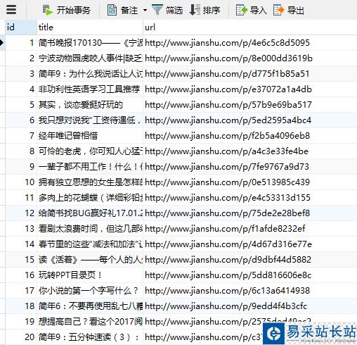 # -*- coding:utf-8 -*-from urllib import requestfrom bs4 import BeautifulSoupimport pymysql# mysql連接信息(字典形式)db_config ={ 'host': '127.0.0.1', 'port': 3306, 'user': 'root', 'password': '', 'db': 'pytest', 'charset': 'utf8'}# 獲得數(shù)據(jù)庫連接connection = pymysql.connect(**db_config)# 數(shù)據(jù)庫配置,獲得連接(參數(shù)方式)# connection = pymysql.connect(host='127.0.0.1',# port=3306,# user='root',# password='',# db='pytest',# charset='utf8')url = r'http://www.jianshu.com/'# 模擬瀏覽器頭headers = { 'User-Agent':'Mozilla/5.0 (Windows NT 10.0; WOW64) AppleWebKit/537.36 (KHTML, like Gecko) Chrome/55.0.2883.87 Safari/537.36'}page = request.Request(url, headers=headers)page_info = request.urlopen(page).read().decode('utf-8')soup = BeautifulSoup(page_info, 'html.parser')urls = soup.find_all('a', 'title')try: # 獲得數(shù)據(jù)庫游標(biāo) with connection.cursor() as cursor: sql = 'insert into titles(title, url) values(%s, %s)' for u in urls: # 執(zhí)行sql語句 cursor.execute(sql, (u.string, r'http://www.jianshu.com'+u.attrs['href'])) # 事務(wù)提交 connection.commit()finally: # 關(guān)閉數(shù)據(jù)庫連接 connection.close()代碼執(zhí)行結(jié)果: