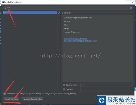 這時我們在搜索框中輸入“bs4”,然后選擇列表中的bs4,然后進行安裝,如下圖: