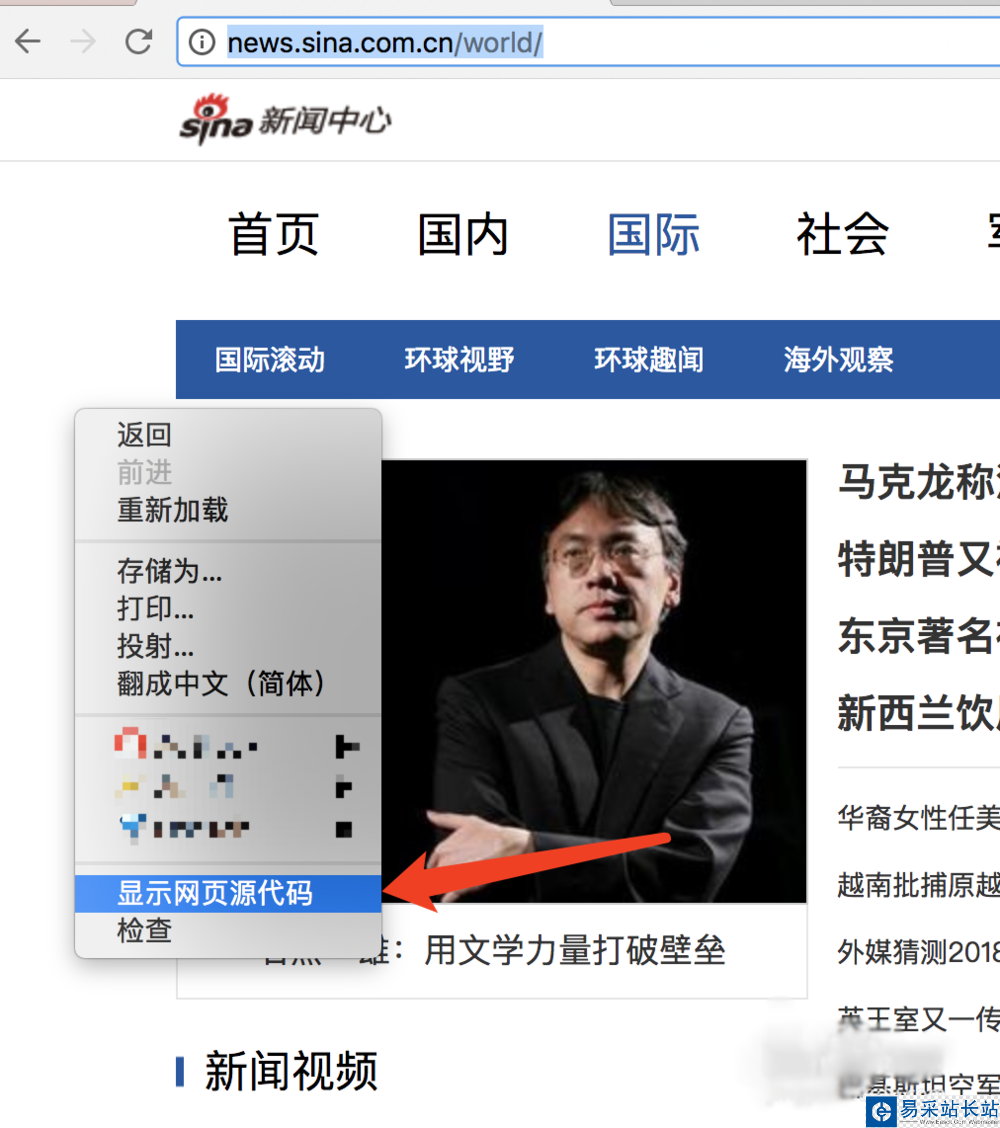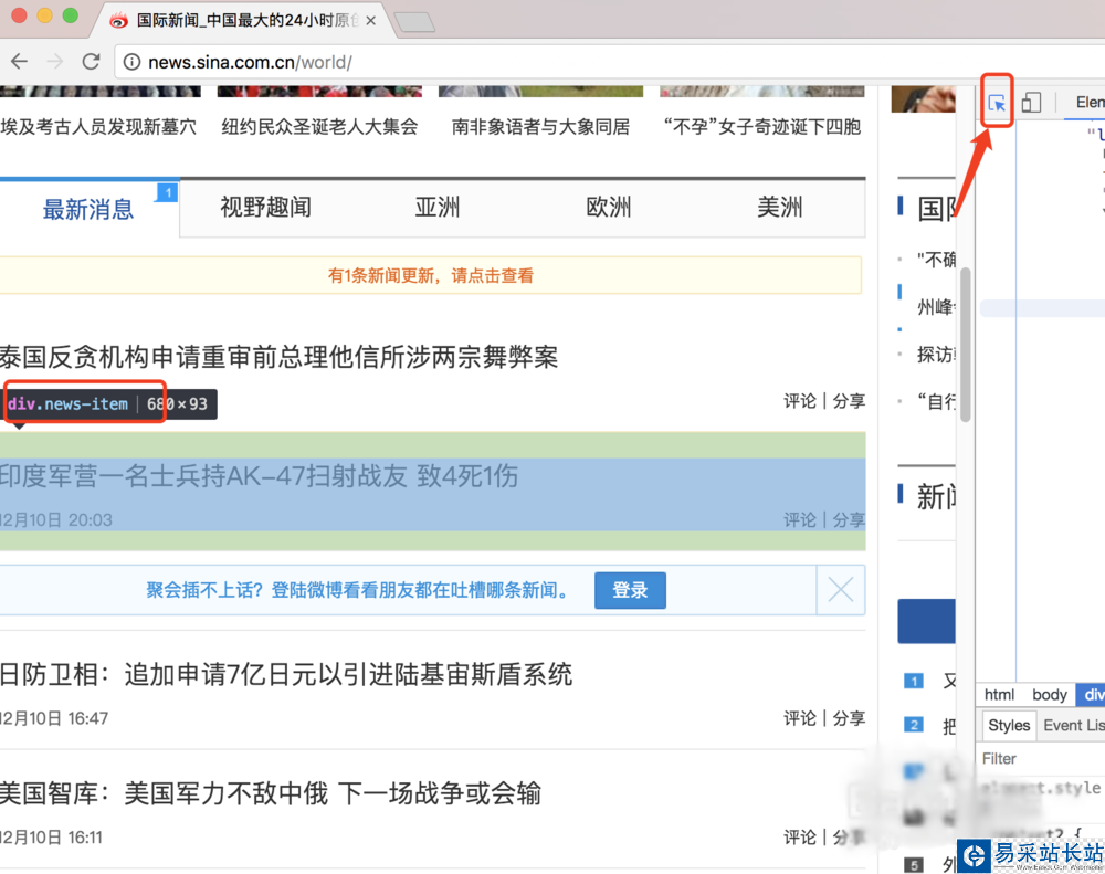 6、拿到數據之后,我們需要先分析數據,看我們想要的數據在哪里,我們打開瀏覽器,右鍵審查,然后按示例圖操作,就可以看到我們新聞所在的標簽,假如是windows系統,選擇開發中工具里面一樣