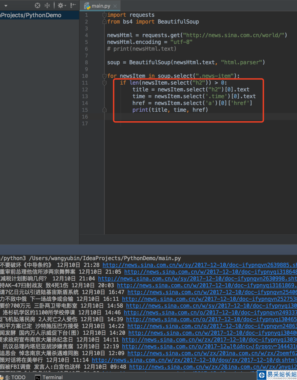 9、然后我們編寫標題時間地址的python程序,就可以爬取出對應的標題內容,時間和地址