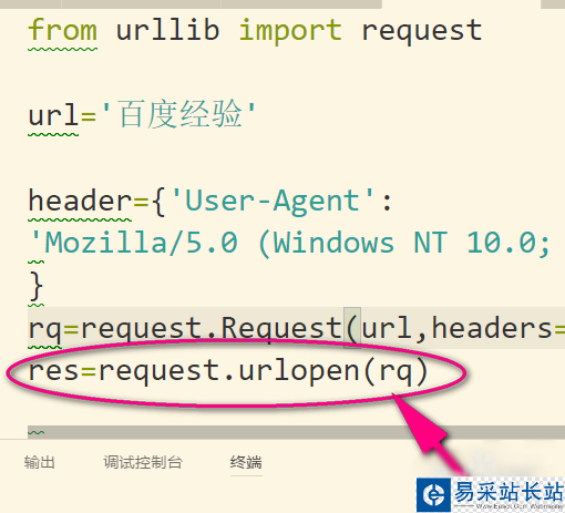 6、請求對象rq就構(gòu)造好了,然后用urlopen發(fā)送這個請求對象就可以了。這就是簡單的請求頭設(shè)置了。