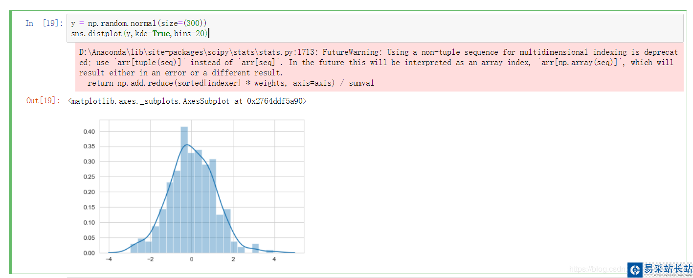 5.sns.distplot(x,kde=bool,bins=n):kde代表是否進行核密度估計,也就是是否繪制包絡線,bins指定繪制的條形數目。