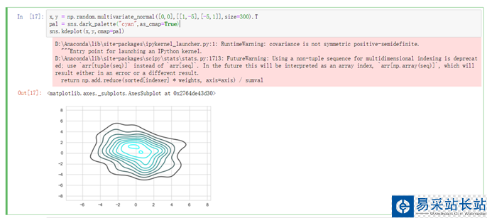 4.sns.kdeplot(x,y,cmap=pal):繪制核密度分布圖。