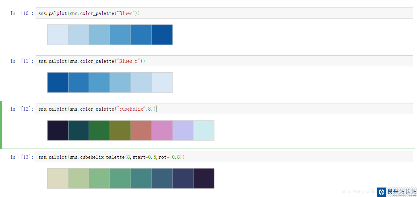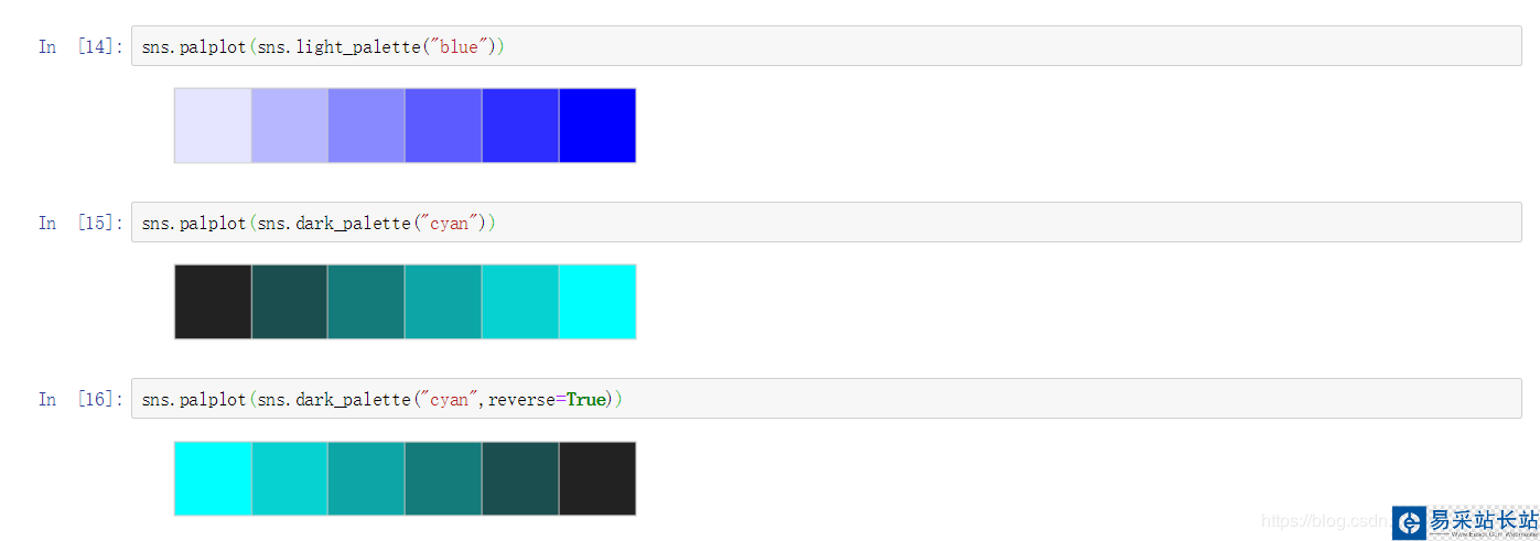sns.palplot(sns.color_palette("hls",n))#顯示出n個不同顏色的色塊sns.palplot(sns.color_palette("Paired",2n))#顯示出2n個不同顏色的色塊,且這些顏色兩兩之間是相近的sns.palplot(sns.color_palette("color"))#由淺入深顯示出同一顏色的色塊sns.palplot(sns.color_palette("color_r"))##由深入淺顯示出同一顏色的色塊sns.palplot(sns.color_palette("cubehelix",n))#顯示出n個顏色呈線性變化的色塊sns.palplot(sns.cubehelix_palette(k,start=m,rot=n))#顯示出k個start(0,3)為m,rot(-1,1)為n的呈線性變化的色塊sns.palplot(sns.light_palette("color"))#將一種顏色由淺到深顯示sns.palplot(sns.dark_palette("color"))#將一種顏色由深到淺顯示sns.palplot(sns.dark_palette("color",reverse=bool))#reverse的值為False,則將一種顏色由深到淺顯示;若為True,則將一種顏色由淺到深顯示