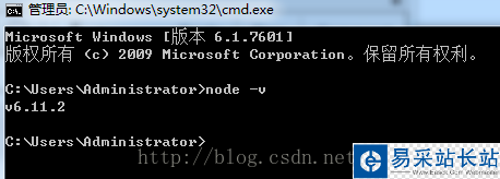 安裝完成后,會自動將路徑加入到環境變量中,在命令行窗口中運行node -v,如果出現版本號,表示安裝正常,如下圖所示