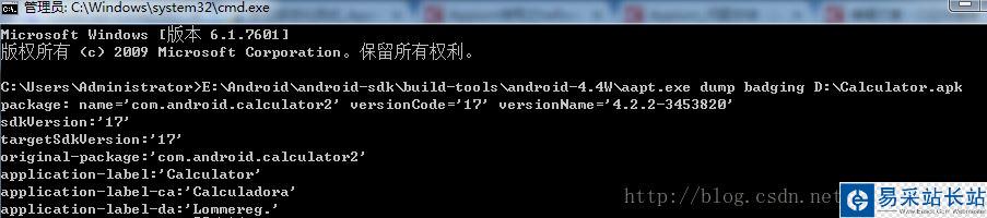 將apk導出后,Android SDK中有一個aapt的工具可以用來查看應用的包名和要啟動的activity名稱,工具在SDK的build-tools目錄下,命令格式為”aapt dump badging apk路徑”