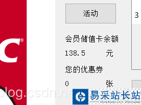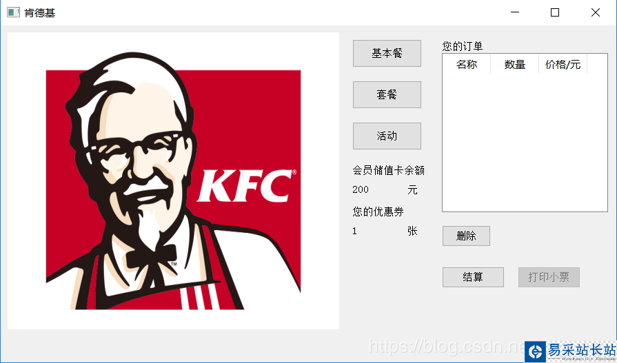 from PyQt5 import QtCore, QtWidgetsclass Ui_MainWindow(object): def setupUi(self, MainWindow): MainWindow.setObjectName("MainWindow") MainWindow.resize(893, 489) self.centralwidget = QtWidgets.QWidget(MainWindow) self.centralwidget.setObjectName("centralwidget") self.pushButton_2 = QtWidgets.QPushButton(self.centralwidget) self.pushButton_2.setGeometry(QtCore.QRect(510, 20, 101, 41)) self.pushButton_2.setObjectName("pushButton_2") self.pushButton_3 = QtWidgets.QPushButton(self.centralwidget) self.pushButton_3.setGeometry(QtCore.QRect(510, 80, 101, 41)) self.pushButton_3.setObjectName("pushButton_3") self.pushButton_4 = QtWidgets.QPushButton(self.centralwidget) self.pushButton_4.setGeometry(QtCore.QRect(510, 140, 101, 41)) self.pushButton_4.setObjectName("pushButton_4") self.label = QtWidgets.QLabel(self.centralwidget) self.label.setGeometry(QtCore.QRect(510, 200, 111, 21)) self.label.setObjectName("label") self.label_2 = QtWidgets.QLabel(self.centralwidget) self.label_2.setGeometry(QtCore.QRect(510, 230, 72, 15)) self.label_2.setObjectName("label_2") self.label_3 = QtWidgets.QLabel(self.centralwidget) self.label_3.setGeometry(QtCore.QRect(590, 230, 21, 16)) self.label_3.setObjectName("label_3") self.label_4 = QtWidgets.QLabel(self.centralwidget) self.label_4.setGeometry(QtCore.QRect(510, 260, 81, 21)) self.label_4.setObjectName("label_4") self.label_5 = QtWidgets.QLabel(self.centralwidget) self.label_5.setGeometry(QtCore.QRect(510, 290, 72, 15)) self.label_5.setObjectName("label_5") self.label_6 = QtWidgets.QLabel(self.centralwidget) self.label_6.setGeometry(QtCore.QRect(590, 290, 21, 16)) self.label_6.setObjectName("label_6") self.label_7 = QtWidgets.QLabel(self.centralwidget) self.label_7.setGeometry(QtCore.QRect(640, 20, 61, 21)) self.label_7.setObjectName("label_7") self.tableWidget = QtWidgets.QTableWidget(self.centralwidget) self.tableWidget.setGeometry(QtCore.QRect(640, 40, 241, 231)) self.tableWidget.setObjectName("tableWidget") self.tableWidget.setColumnCount(3) self.tableWidget.setRowCount(0) item = QtWidgets.QTableWidgetItem() self.tableWidget.setHorizontalHeaderItem(0, item) item = QtWidgets.QTableWidgetItem() self.tableWidget.setHorizontalHeaderItem(1, item) item = QtWidgets.QTableWidgetItem() self.tableWidget.setHorizontalHeaderItem(2, item) self.tableWidget.horizontalHeader().setDefaultSectionSize(70) self.pushButton_5 = QtWidgets.QPushButton(self.centralwidget) self.pushButton_5.setGeometry(QtCore.QRect(640, 290, 71, 31)) self.pushButton_5.setObjectName("pushButton_5") self.pushButton_6 = QtWidgets.QPushButton(self.centralwidget) self.pushButton_6.setGeometry(QtCore.QRect(640, 350, 91, 31)) self.pushButton_6.setObjectName("pushButton_6") self.pushButton_7 = QtWidgets.QPushButton(self.centralwidget) self.pushButton_7.setGeometry(QtCore.QRect(750, 350, 91, 31)) self.pushButton_7.setObjectName("pushButton_7") self.label_8 = QtWidgets.QLabel(self.centralwidget) self.label_8.setGeometry(QtCore.QRect(10, 10, 481, 431)) self.label_8.setObjectName("label_8") MainWindow.setCentralWidget(self.centralwidget) self.menubar = QtWidgets.QMenuBar(MainWindow) self.menubar.setGeometry(QtCore.QRect(0, 0, 893, 26)) self.menubar.setObjectName("menubar") MainWindow.setMenuBar(self.menubar) self.statusbar = QtWidgets.QStatusBar(MainWindow) self.statusbar.setObjectName("statusbar") MainWindow.setStatusBar(self.statusbar) self.retranslateUi(MainWindow) QtCore.QMetaObject.connectSlotsByName(MainWindow) def retranslateUi(self, MainWindow): _translate = QtCore.QCoreApplication.translate MainWindow.setWindowTitle(_translate("MainWindow", "肯德基")) self.pushButton_2.setText(_translate("MainWindow", "基本餐")) self.pushButton_3.setText(_translate("MainWindow", "套餐")) self.pushButton_4.setText(_translate("MainWindow", "活動")) self.label.setText(_translate("MainWindow", "會員儲值卡余額")) self.label_2.setText(_translate("MainWindow", "錢")) self.label_3.setText(_translate("MainWindow", "元")) self.label_4.setText(_translate("MainWindow", "您的優惠券")) self.label_5.setText(_translate("MainWindow", "券")) self.label_6.setText(_translate("MainWindow", "張")) self.label_7.setText(_translate("MainWindow", "您的訂單")) item = self.tableWidget.horizontalHeaderItem(0) item.setText(_translate("MainWindow", "名稱")) item = self.tableWidget.horizontalHeaderItem(1) item.setText(_translate("MainWindow", "數量")) item = self.tableWidget.horizontalHeaderItem(2) item.setText(_translate("MainWindow", "價格/元")) self.pushButton_5.setText(_translate("MainWindow", "刪除")) self.pushButton_6.setText(_translate("MainWindow", "結算")) self.pushButton_7.setText(_translate("MainWindow", "打印小票")) self.label_8.setText(_translate("MainWindow", "圖"))