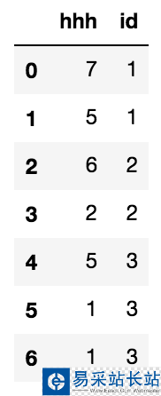 sample = pd.DataFrame(np.random.randint(low=1,high=9,size=(7,1)),columns=['hhh'])sample['id'] = [1,1,2,2,3,3,3]# 輸出: