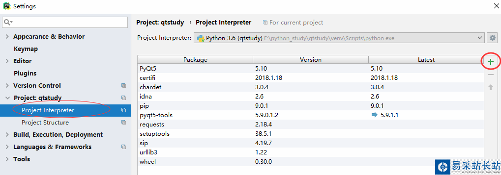 2、新建一個空的python工程,找到setting安裝第三方模塊PyQT5,點加號,先安PyQT5,再安裝pyqt5-tools,后面包含qtdesinger