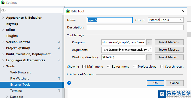 6、再點加號,添加pyuic5的參數,這個是把qt的UI文件轉換成.py文件的工具,program:E:/python_study/qtstudy/venv/Scripts/pyuic5.exe,這個也需要改成你自己的,