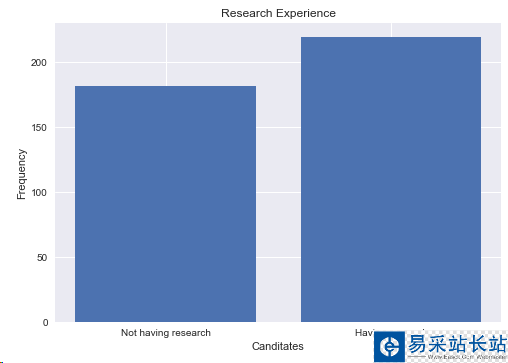 print("Not Having Research:",len(df[df.Research == 0]))print("Having Research:",len(df[df.Research == 1]))y = np.array([len(df[df.Research == 0]),len(df[df.Research == 1])])x = np.arange(2)plt.bar(x,y)plt.title("Research Experience")plt.xlabel("Canditates")plt.ylabel("Frequency")plt.xticks(x,('Not having research','Having research'))plt.show()
