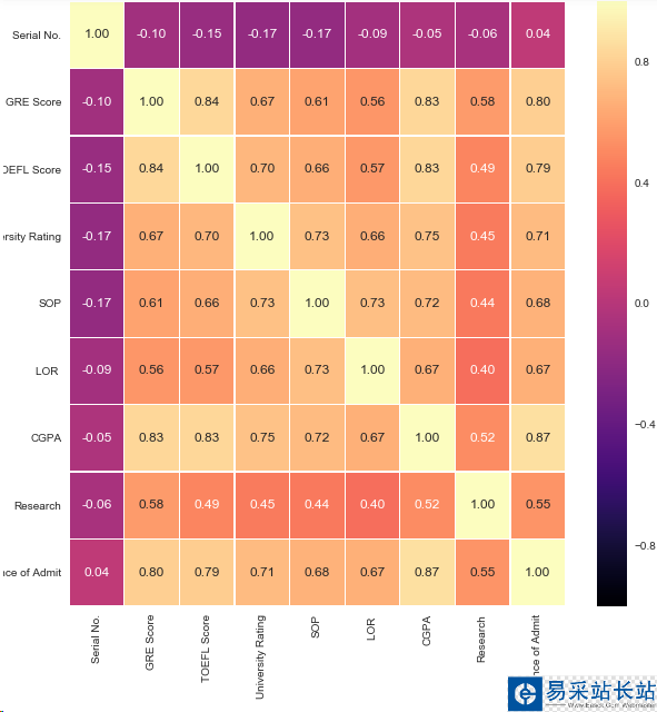 1.數據有9個特征,分別是學號,GRE分數,托福分數,學校等級,SOP,LOR,CGPA,是否參加研習,進修的幾率