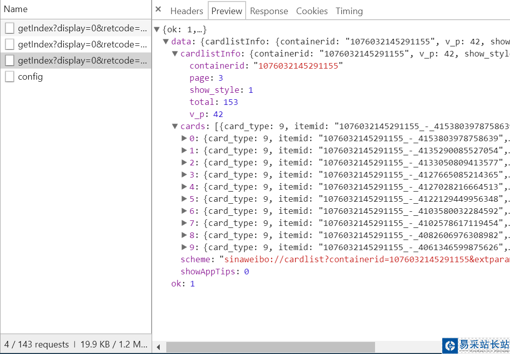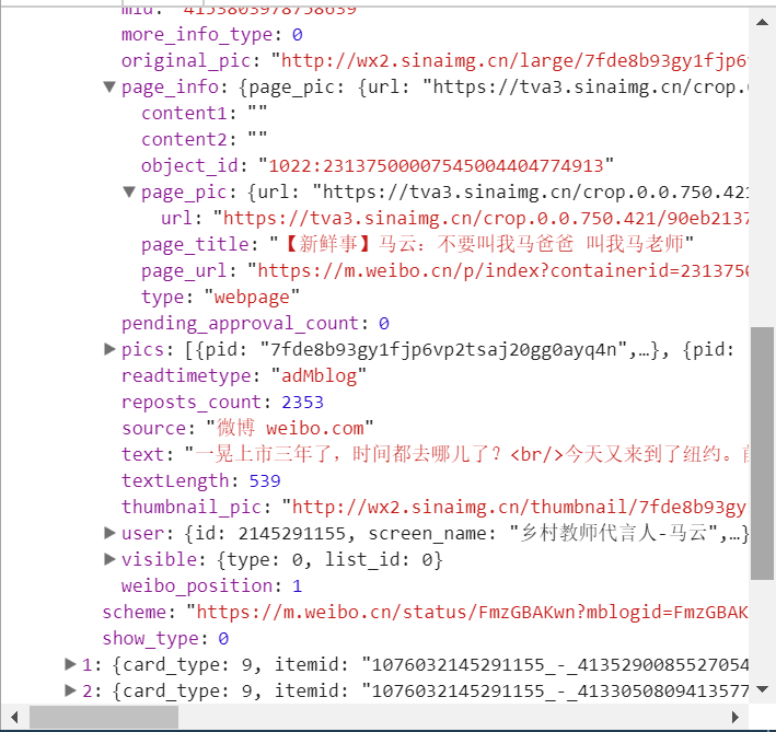 它是一個 Json 格式,瀏覽器開發者工具自動為做了解析方便我們查看,可以看到最關鍵的兩部分信息就是 cardlistInfo 和 cards,將二者展開,cardlistInfo 里面包含了一個比較重要的信息就是 total,經過觀察后發現其實它是微博的總數量,我們可以根據這個數字來估算出分頁的數目。