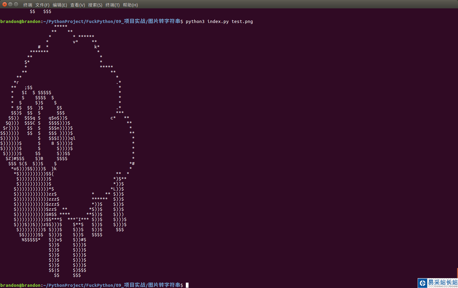 # !/usr/bin/env python# -*- coding:utf-8 -*-from PIL import Imageimport argparse#命令行輸入?yún)?shù)處理parser = argparse.ArgumentParser()parser.add_argument('file')   #輸入文件parser.add_argument('-o', '--output')  #輸出文件parser.add_argument('--width', type = int, default = 50) #輸出字符畫寬parser.add_argument('--height', type = int, default = 50) #輸出字符畫高#獲取參數(shù)args = parser.parse_args()IMG = args.fileWIDTH = args.widthHEIGHT = args.heightOUTPUT = args.output# 字符畫使用的字符集ascii_char = list("$@B%8&WM#*oahkbdpqwmZO0QLCJUYXzcvunxrjft//|()1{}[]?-_+~<>i!lI;:,/"^`'. ")def get_char(r,g,b,alpha = 256):  """將256灰度映射到70個字符上"""  if alpha == 0:    return ' '  length = len(ascii_char)  # 計算灰度的公式  gray = int(0.2126 * r + 0.7152 * g + 0.0722 * b)  unit = (256.0 + 1)/length  index=int(gray/unit)  return ascii_char[index]if __name__ == '__main__':  im = Image.open(IMG)  im = im.resize((WIDTH,HEIGHT), Image.NEAREST)  txt = ""  # 獲取每個像素點對應(yīng)的字符  for i in range(HEIGHT):    for j in range(WIDTH):      txt += get_char(*im.getpixel((j,i)))    txt += '/n'  print(txt)  #字符畫輸出到文件  if OUTPUT:    with open(OUTPUT,'w') as f:      f.write(txt)  else:    with open("output.txt",'w') as f:      f.write(txt)z運行結(jié)果