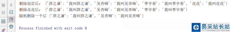 #刪除字典內容myDict1.pop("趙雷") #標準刪除姿勢print("刪除趙雷后:",myDict1)del myDict1['花花'] # 換個姿勢刪除print("刪除花花后:",myDict1)myDict1.popitem()  #隨機刪除一個print("隨機刪除一個后",myDict1)結果: