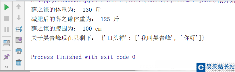 #多級字典(嵌套字典)FamousDict = {  '薛之謙':{    '身高':178,    '體重':130,    '口頭禪':['你神經病啊!','我不要面子啊']  #相應的值可以是 一個列表  },  '吳青峰':{    '身高':170,    '體重':120,    '口頭禪':['我叫吳青峰','你好']  }}#訪問多級字典:print('薛之謙的體重為:',FamousDict['薛之謙']['體重'],'斤')#修改薛之謙體重為125FamousDict['薛之謙']['體重'] = 125print('減肥后的薛之謙體重為:',FamousDict['薛之謙']['體重'],'斤')#新添薛之謙腰圍100FamousDict['薛之謙']['腰圍'] = 100print('薛之謙的腰圍為:',FamousDict['薛之謙']['腰圍'],'cm')#多級字典刪除FamousDict['吳青峰'].pop('身高') #標準刪除del FamousDict['吳青峰']['體重'] #另一個刪除方法print('關于吳青峰現在只剩下:',FamousDict['吳青峰'])結果為: