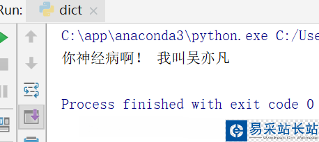 #修改字典內容myDict1['薛之謙'] = '你神經病啊!' #存在直接修改myDict1['吳亦凡'] = '我叫吳亦凡' #不存在的直接添加print(myDict1['薛之謙'] ,myDict1['吳亦凡'])
