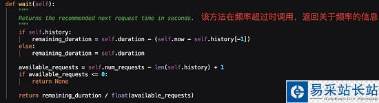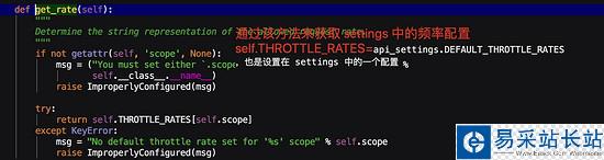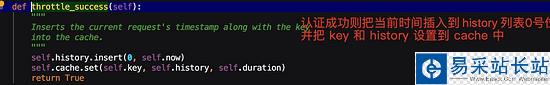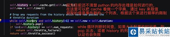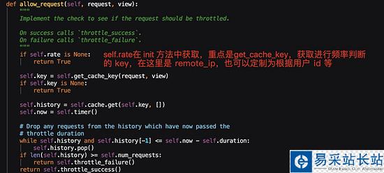 # from rest_framework.throttling import BaseThrottleclass BookThrottle(BaseThrottle):  VISIT_RECORD = {}  def __init__(self):    self.history = None  def allow_request(self, request, view):    print(request.META)    REMOTE_ADDR = request.META.get('REMOTE_ADDR')    import time    ctime = time.time()    if REMOTE_ADDR not in self.VISIT_RECORD:      self.VISIT_RECORD[REMOTE_ADDR] = [ctime,]      return True    self.history = self.VISIT_RECORD.get(REMOTE_ADDR)    while self.history and ctime - self.history[-1] > 60:      self.history.pop()    if len(self.history) < 3:      self.history.insert(0, ctime)      return True    else:      return False  def wait(self):    import time    ctime = time.time()    return 60 - (ctime - self.history[-1])# 頻率類代碼注釋     # 訪問頻率的邏輯#     #   {'ip地址':[16:13:39,16:13:19,],'ip地址2':[時(shí)間1,時(shí)間2],}#     # (1)取出訪問者ip#     # (2)判斷當(dāng)前ip不在訪問字典里,添加進(jìn)去,并且直接返回True,表示第一次訪問,在字典里,繼續(xù)往下走#     # (3)循環(huán)判斷當(dāng)前ip的列表,有值,并且當(dāng)前時(shí)間減去列表的最后一個(gè)時(shí)間大于60s,把這種數(shù)據(jù)pop掉,這樣列表中只有60s以內(nèi)的訪問時(shí)間,#     # (4)判斷,當(dāng)列表小于3,說明一分鐘以內(nèi)訪問不足三次,把當(dāng)前時(shí)間插入到列表第一個(gè)位置,返回True,順利通過#     # (5)當(dāng)大于等于3,說明一分鐘內(nèi)訪問超過三次,返回False驗(yàn)證失敗#     #(1)取出訪問者ip#     # print(request.META)#     # REMOTE_ADDR 就是訪問者的ip:127.0.0.1#     ip=request.META.get('REMOTE_ADDR')#     import time#     # 獲取當(dāng)前時(shí)間#     ctime=time.time()#     # (2)判斷當(dāng)前ip不在訪問字典里,添加進(jìn)去,并且直接返回True,表示第一次訪問#     if ip not in self.VISIT_RECORD:#       self.VISIT_RECORD[ip]=[ctime,]#       # {'127.0.0.1':[時(shí)間1,時(shí)間1,]}#       return True#     # self.history=[時(shí)間1,時(shí)間1,]#     self.history=self.VISIT_RECORD.get(ip)#     # (3)循環(huán)判斷當(dāng)前ip的列表,有值,并且當(dāng)前時(shí)間減去列表的最后一個(gè)時(shí)間大于60s,把這種數(shù)據(jù)pop掉,這樣列表中只有60s以內(nèi)的訪問時(shí)間,#     while self.history and ctime-self.history[-1]>60:#       self.history.pop()#     # (4)判斷,當(dāng)列表小于3,說明一分鐘以內(nèi)訪問不足三次,把當(dāng)前時(shí)間插入到列表第一個(gè)位置,返回True,順利通過#     # (5)當(dāng)大于等于3,說明一分鐘內(nèi)訪問超過三次,返回False驗(yàn)證失敗#     if len(self.history)<3:#       self.history.insert(0,ctime)#       return True#     else:#       return False