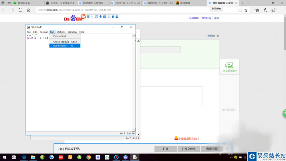 6、接著可以通過chr函數(shù)將數(shù)字值轉(zhuǎn)換為該值對(duì)應(yīng)的字符,我們通過一個(gè)變量將其保存,然后通過print連續(xù)打印三次,或者直接將變量相加三次打印,就像這樣:
