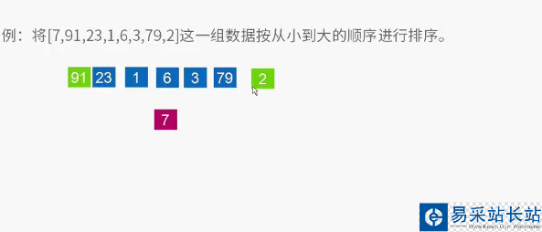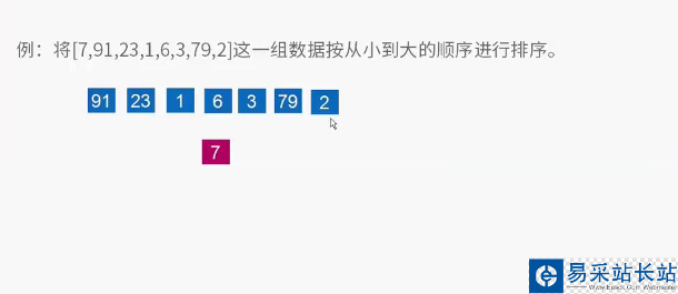 7、i指針與基準數據7比較,其中91比7大,所以將91排到右邊,此時又一次進行了交叉移動,所以下一個比較的是j指針對應的數據。